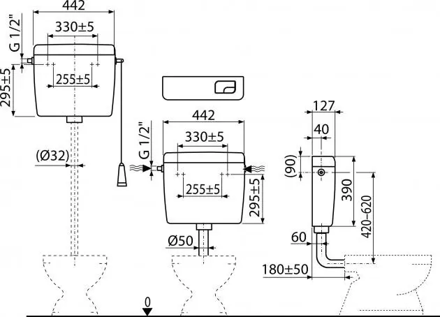 Inbegrepen in de verpakking: inbouwreservoir, vul- (1/2″) en aftapkraan, bocht Ø50/40 mm voor laaggelegen inbouwreservoir, spoelset voor hooggelegen inbouwreservoir (koord, houder, hendel), spoelset voor laaggelegen inbouwreservoir (knop klein, groot), bevestigingsstelschroef Ø5×40 – 2 st, plug Ø8 – 2 st.