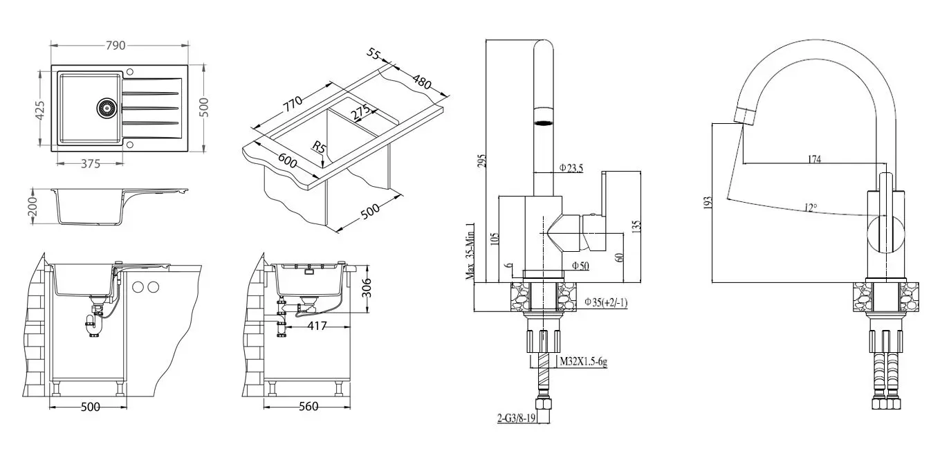 Set keukenspoelbak Cadit 20 met afvoerregeling en kraan Tonia
