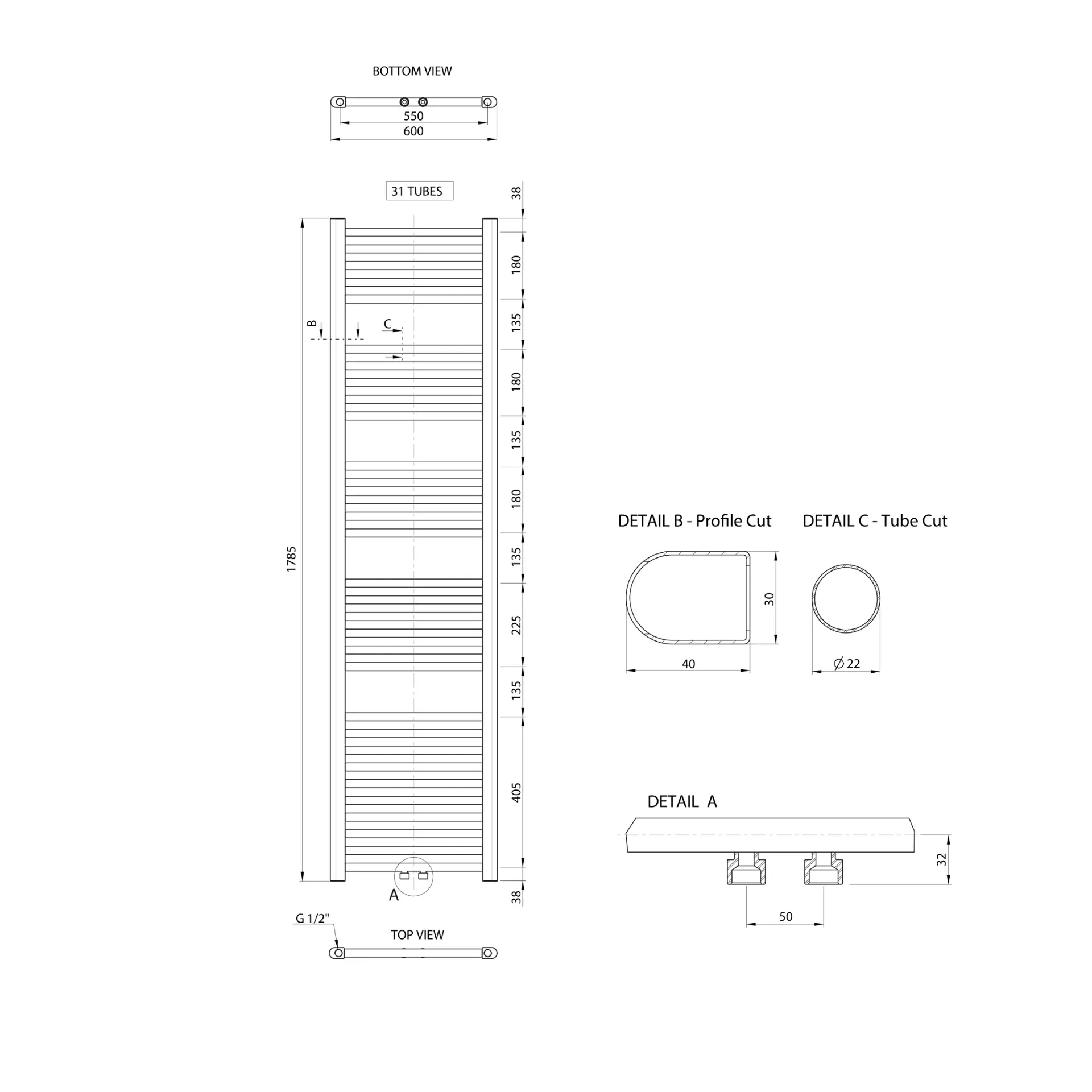 Verwarmingsstaaf en aansluitventielen worden niet bij de radiator meegeleverd.