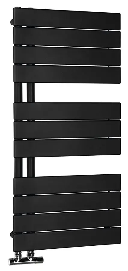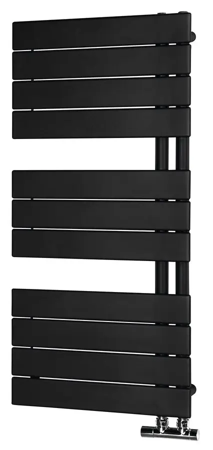 Stijlvolle radiator gemaakt van gladde afgeronde stalen profielen. Asymmetrisch ontwerp, dat uiterst praktisch is voor het drogen van handdoeken.