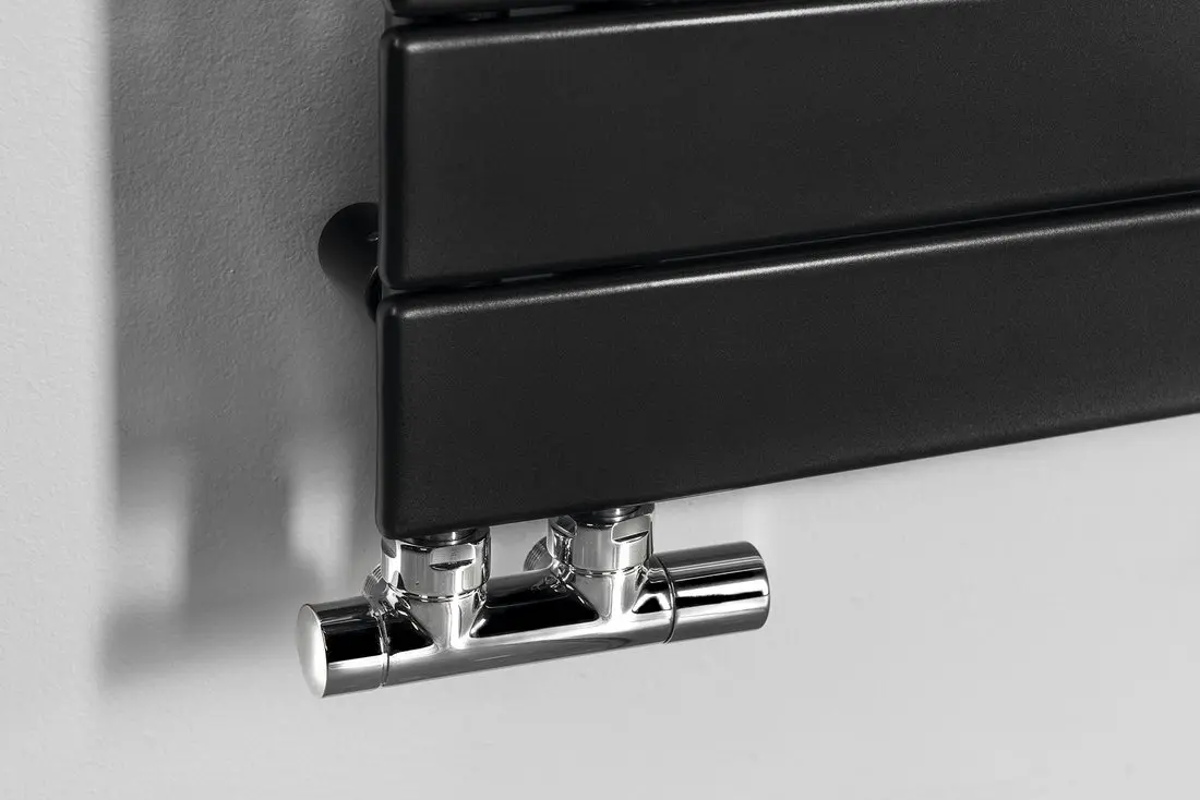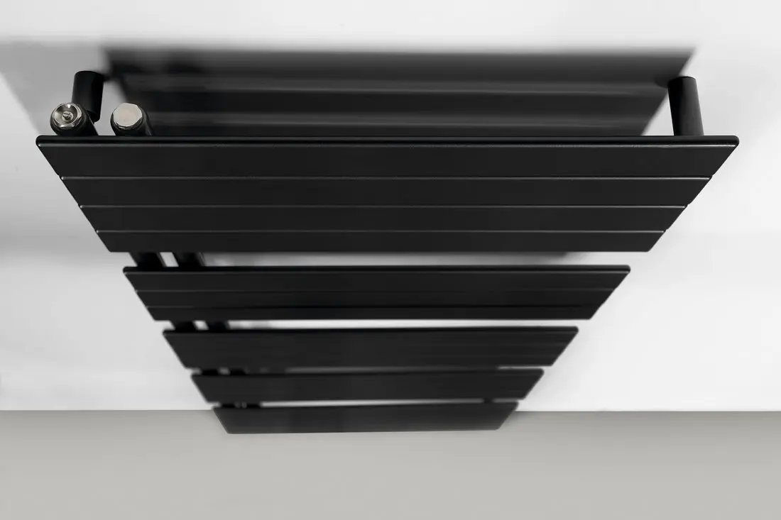 Stijlvolle radiator gemaakt van gladde afgeronde stalen profielen. Asymmetrisch ontwerp, dat uiterst praktisch is voor het drogen van handdoeken.