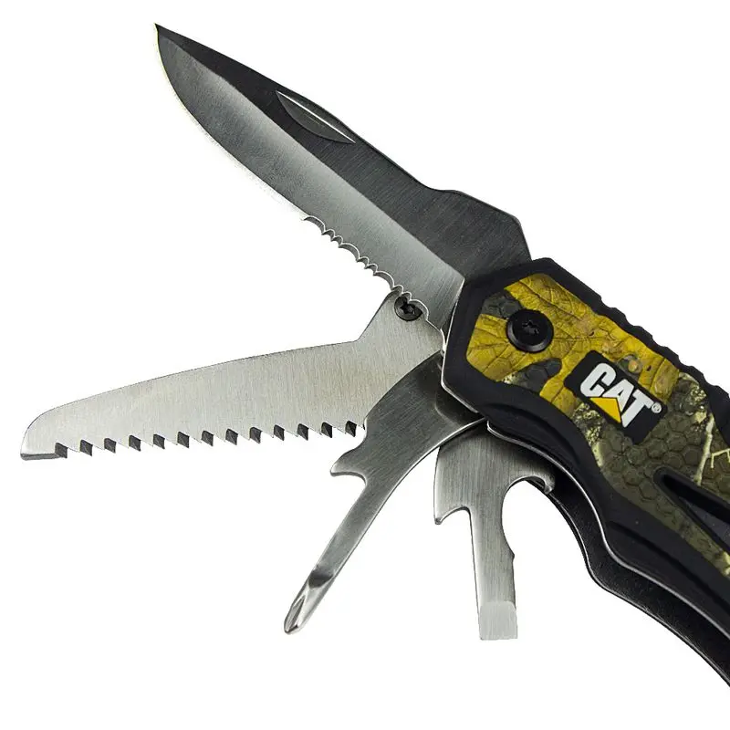 - inclusief tangen met veer/klemtangen, draadknippers, snijmes met veiligheidsvergrendeling en gekartelde rand, rechte/kruiskopschroevendraaiers, flesopener, vijl, zaag, glasbreker