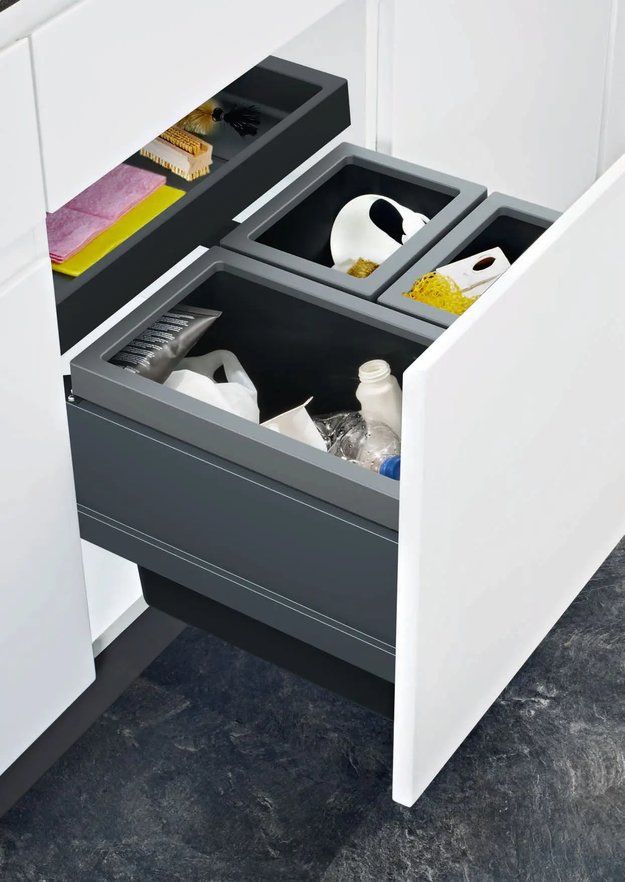 De afvalemmers uit 350, Trolley Vario en Easysort serie worden geplaatst in een behuizing met uittrekmechanisme. De behuizing is voorzien van een reling en hoge zijwand. Voor deze afvalemmers raden wij de volledig uittrekbare systemen Blum, Grass of Hettich aan.