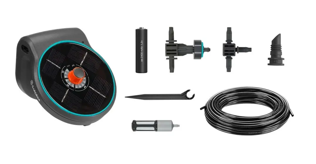 - Het combineert een pomp voor het pompen van water, een controller voor het definiëren van het irrigatieschema en een zonnepaneel dat de meegeleverde oplaadbare batterijen van stroom voorziet