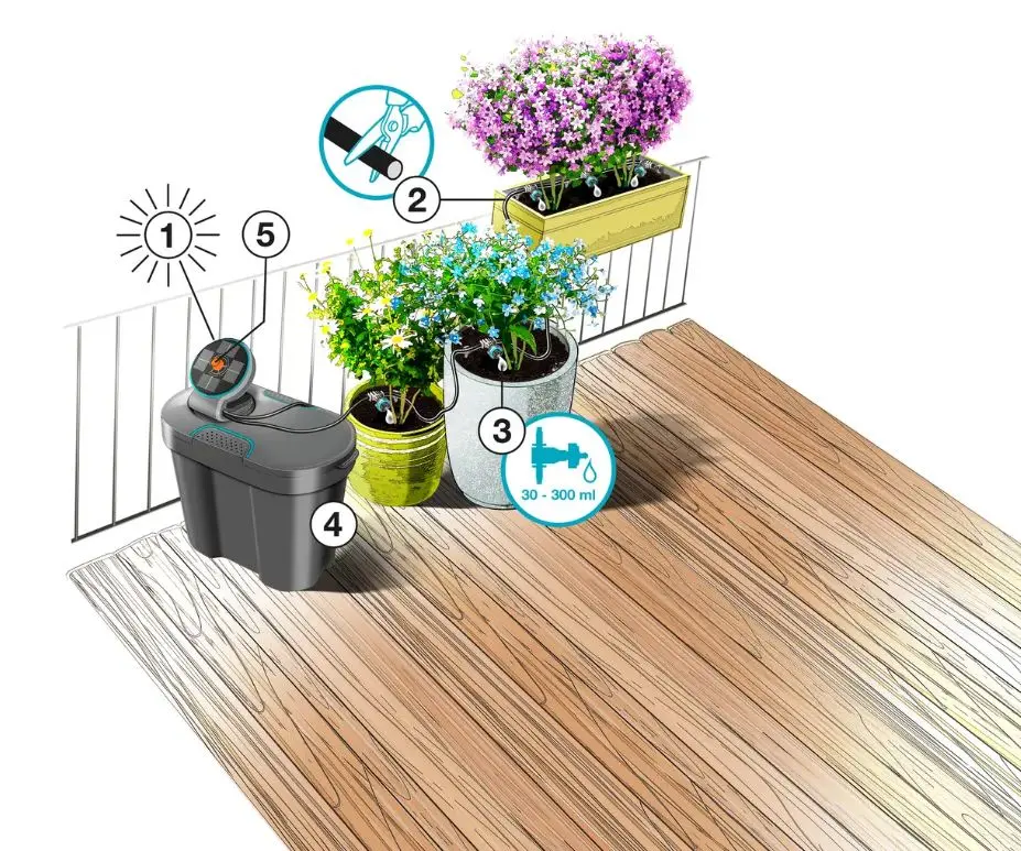 - Met de GARDENA AquaBloom voor besproeiing op zonne-energie zijn uw balkon- en potplanten het hele seizoen in goede handen