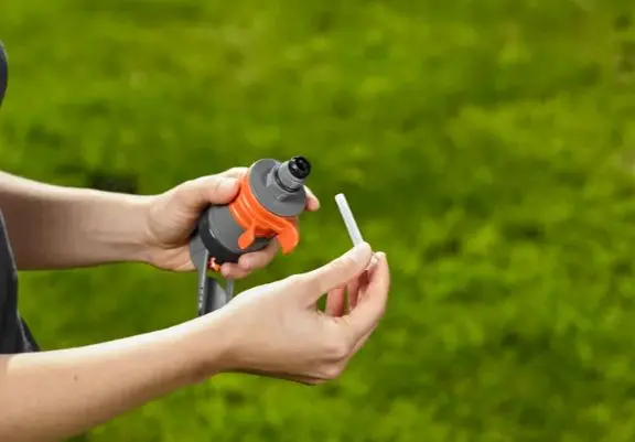 - De sproeier is voorzien van een Original GARDENA systeemaansluiting en eindkap