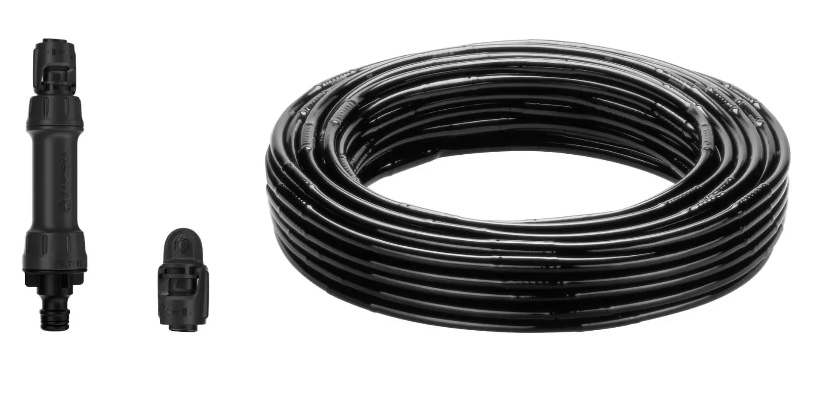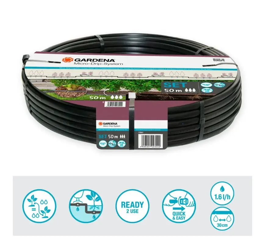 - De GARDENA Micro-Drip-Set voor heg-/struikbesproeiing (50 m) zorgt voor een betrouwbare en waterbesparende besproeiing van uw heggen, struiken, heesters of planten in de voortuin