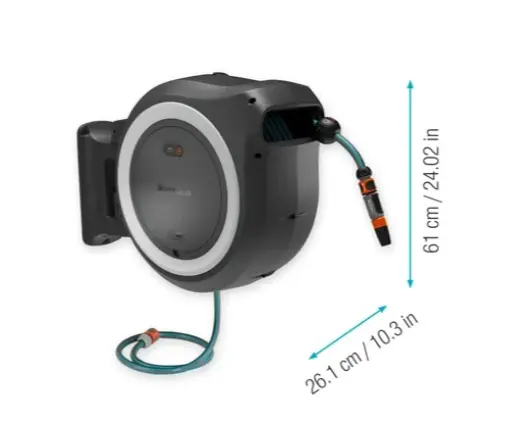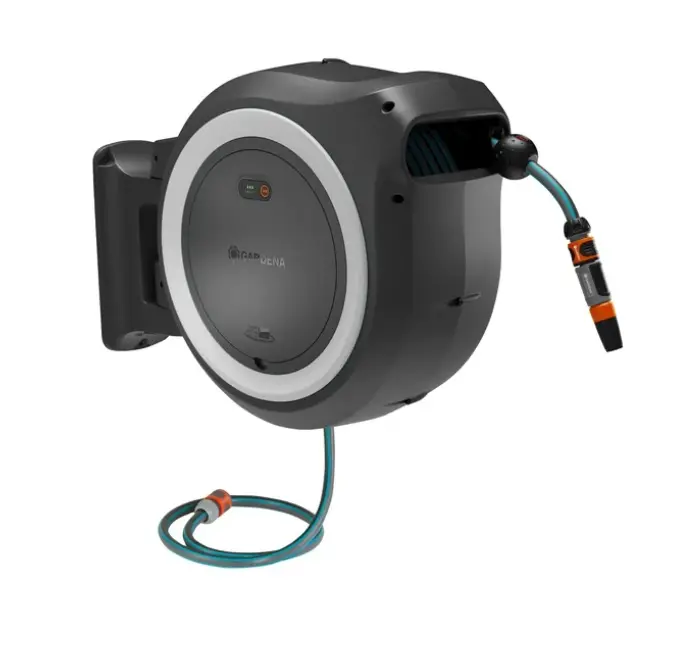 - Na gebruik trekt de PowerRoll XL slangenbox voor wandmontage de slang automatisch in met één druk op de knop