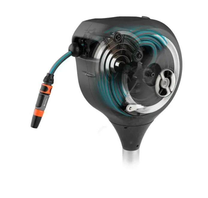- De geïntegreerde slanggeleiding maakt onder andere gelijkmatig intrekken mogelijk zonder dat de tuinslang knikt of in de war raakt