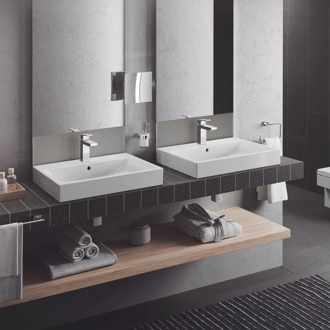 De GROHE Cube Ceramic wastafel wordt gekenmerkt door zijn geavanceerde design aan binnen- en buitenkant. De elegante lijnen en zuivere vormen ervan worden aangevuld met moderne materialen en verfijnde afwerkingen. Het keramische sanitair uit de GROHE Cube Ceramic lijn is ontworpen om perfect te harmoniëren met de vier lijnen badkamerkranen van GROHE – Eurocube, Lineare, Allure en Allure Brilliant – om uw badkamer naar een perfect niveau van esthetiek en vermogen te tillen. Door te kiezen voor sanitair van GROHE kiest u voor de knowhow van een expert van wereldformaat, het bedrijf GROHE , en voor meer dan een eeuw ervaring en technologische expertise van de Japanse fabrikant LIXIL, leider in de afwerkingstechnologie. GROHE Cube Ceramics – eenduidig design, dat de garantie is voor een stijlvolle en moderne badkamer.