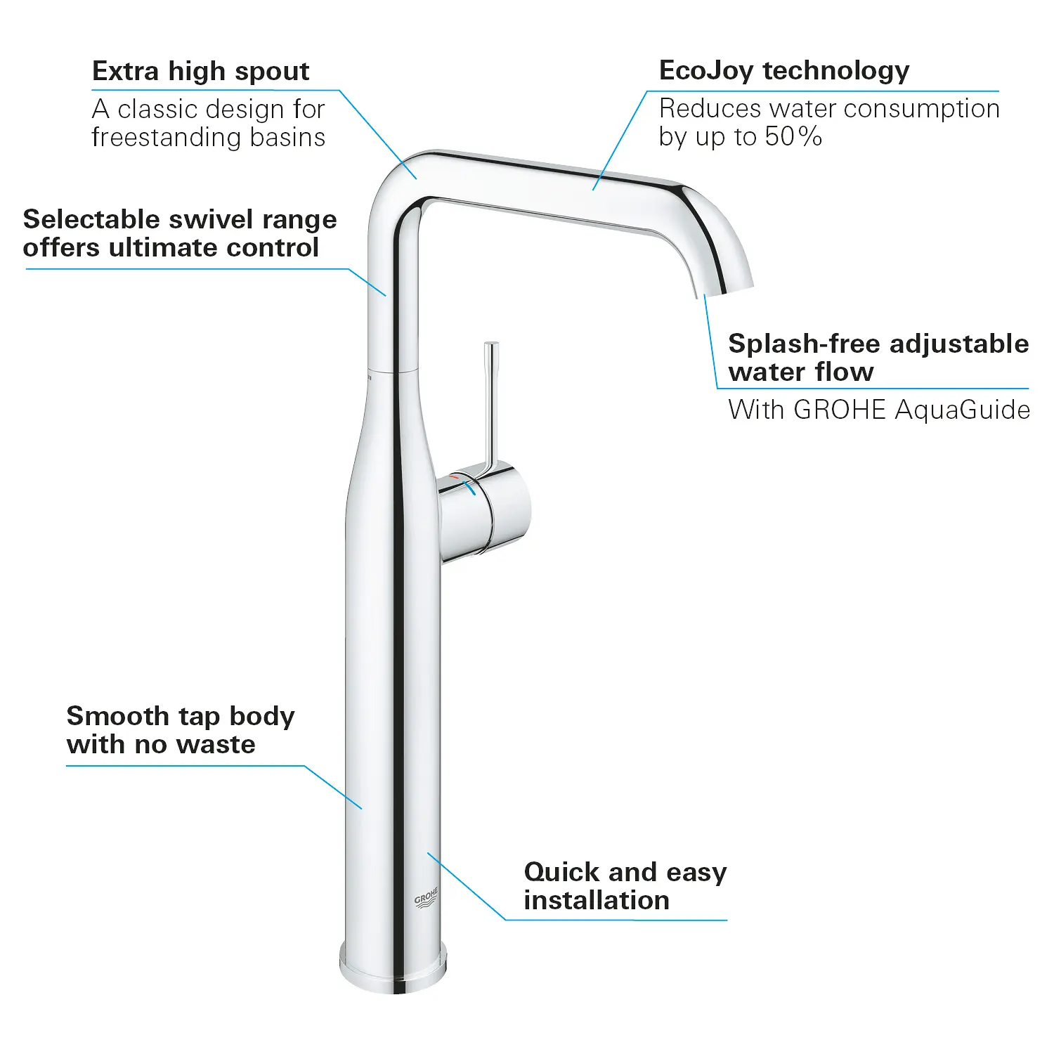 Een opzetwastafel kan niet zonder een hoge wastafelkraan. Kies voor deze XL GROHE Essence eengreeps wastafelmengkraan en geniet van puur vakmanschap, slimme functionaliteiten en hoogstaand design. Gladde, minimalistische lijnen, nauwkeurig vervaardigde details en stralende chromen oppervlakken maken van deze kraan simpelweg de juiste partner voor je vrijstaande wastafel.