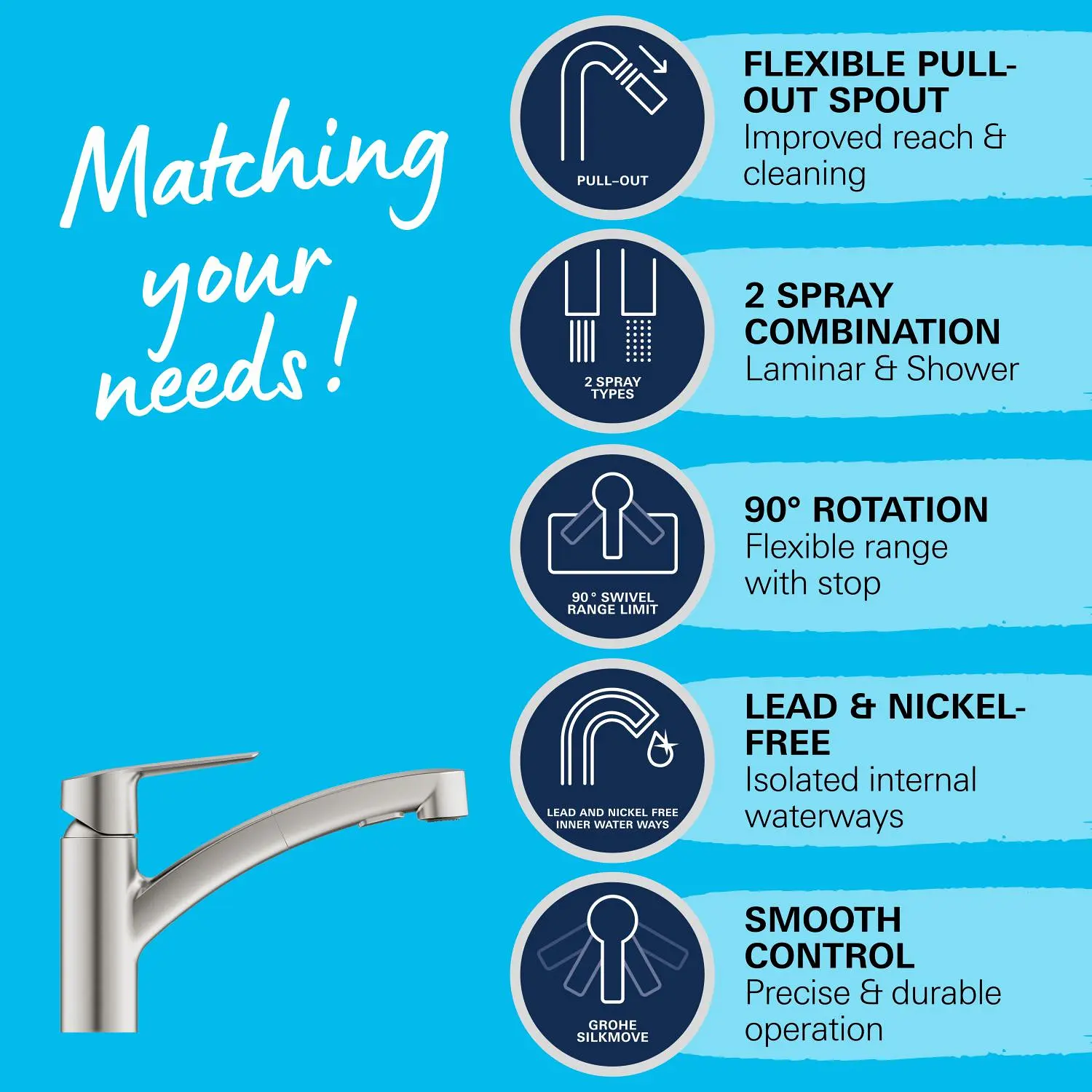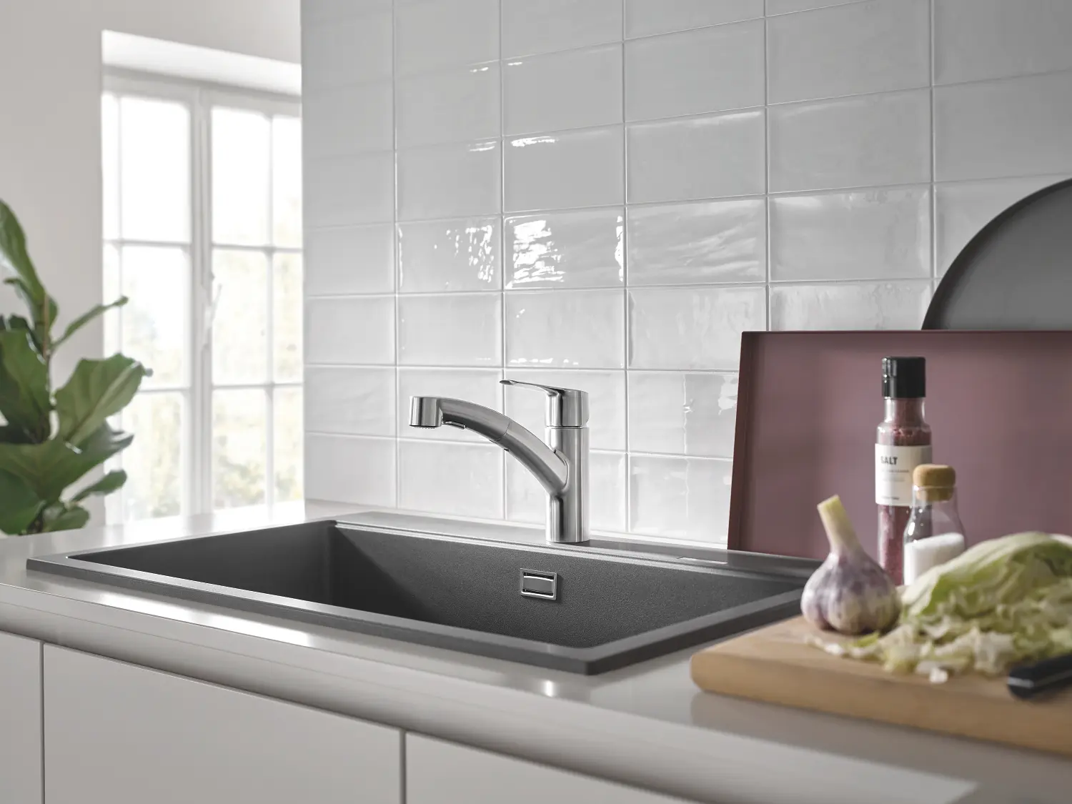 Hoe zorg je voor maximale flexibiliteit bij het gebruik van een keukenkraan? De fabrikant Grohe biedt bij de Grohe QuickFix Start-kraan twee methoden aan. Er is een draaibare uitloop met een draaihoek tot 90° en een uittrekbare kraankop met omschakeling tussen normale en douchestraal.