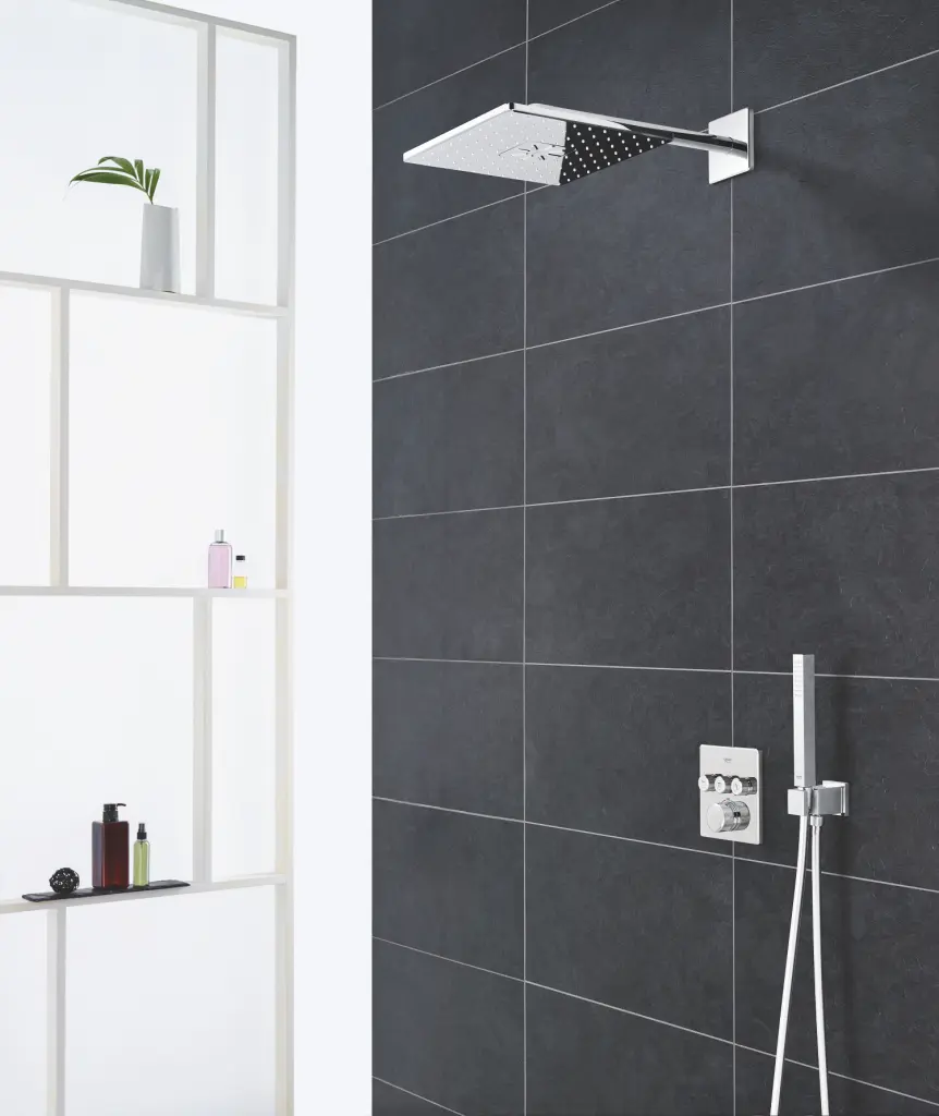 Je hoeft je zelfs geen zorgen te maken over kalkaanslag. Dankzij de speciale GROHE SpeedClean siliconen noppen kun je de eventuele kalkaanslag op de douchekop eenvoudig verwijderen door er simpelweg je vinger overheen te halen. De hoofddouche blijft jarenlang glanzend dankzij de GROHE StarLight beschermlaag waardoor het oppervlak ook eens onderhoudsvriendelijk is. De hoofddouche is voorzien van een 430 mm lange douche-arm. Het compatibele inbouwdeel moet echter apart besteld worden.