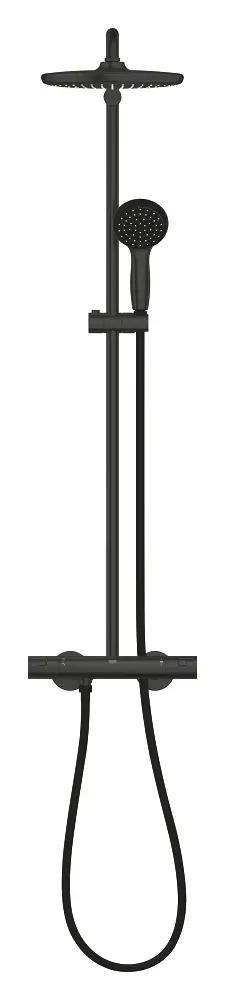 De Grohe doucheset in een elegante matzwarte kleurstelling biedt een totaaloplossing voor de perfecte douche-ervaring. In het pakket vindt u een aan de muur gemonteerde thermostatische kraan uitgerust met innovatieve TurboStat-technologie met een compacte cartridge en een gewaxt thermokoppel. De veiligheid wordt gewaarborgd door SafeStop met veiligheidsvergrendeling ingesteld op 38°C en SafeStop Plus met optionele temperatuurbegrenzer op 43°C. Deze kraan maakt het gemakkelijk om te wisselen tussen hand- en hoofddouches.