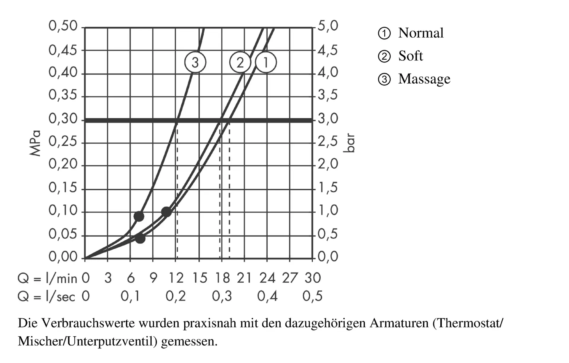 - debiet massagestraal (bij 0,3 MPa): 12 l/min
