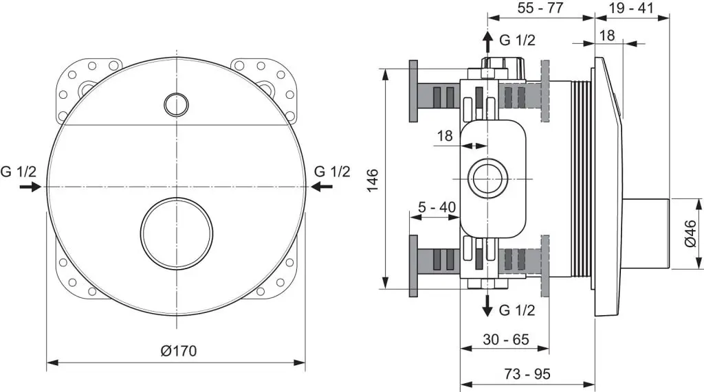 CeraPlus inbouw sensor/douchemengkraan DN 15 met temperatuurregeling door middel van een speciaal mechanisme.