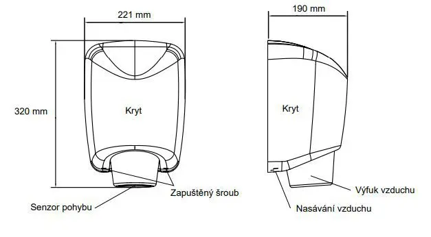 De droger start automatisch wanneer u uw handen erin steekt. De lucht wordt gefilterd door een stoffilter.