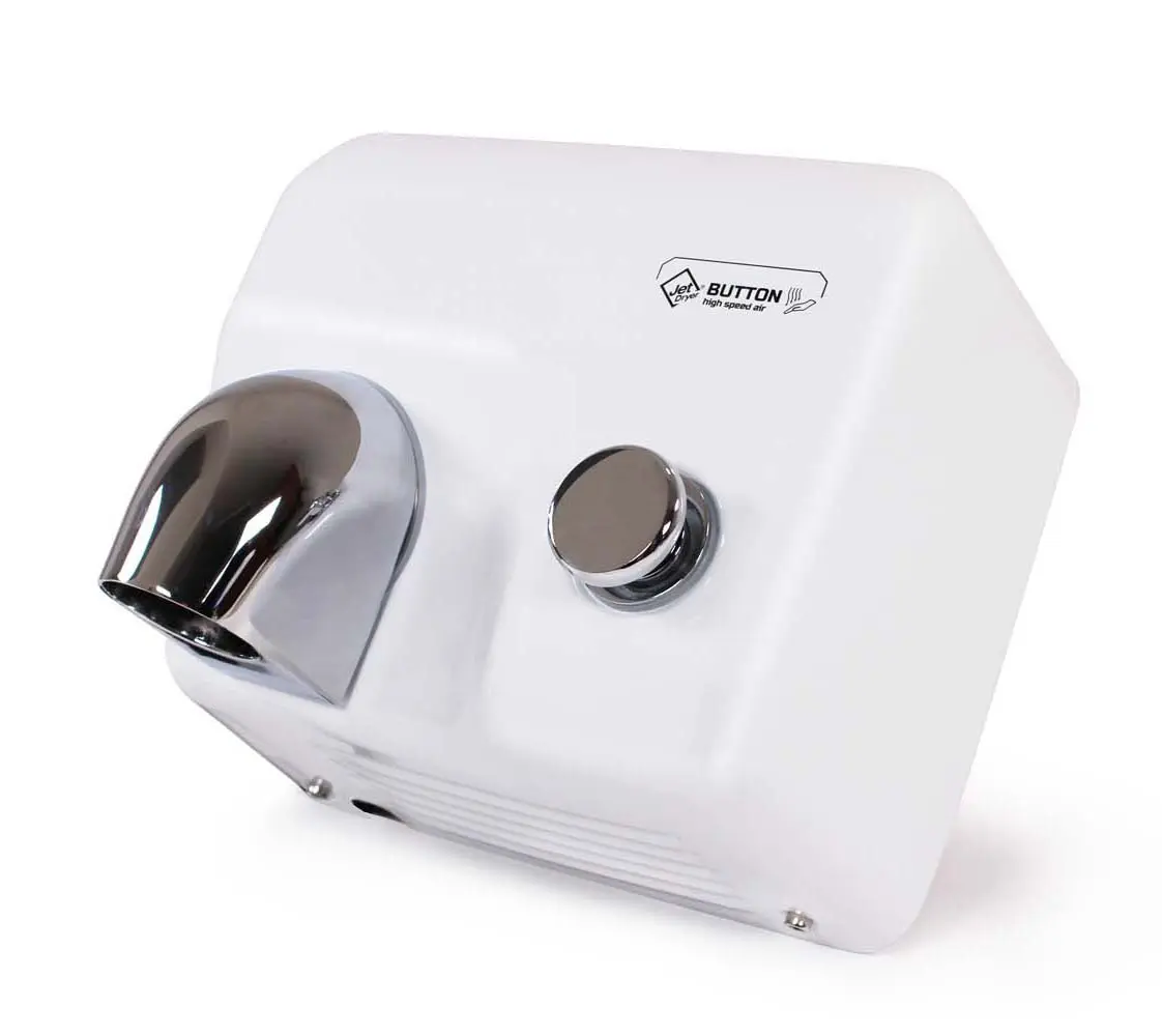 De krachtige handdroger in antivandaaluitvoering, de Jet Dryer BUTTON, verrast u met zijn droogsnelheid en het draaibare mondstuk. Het kan tevens gebruikt worden voor het drogen van het gezicht of als haardroger.