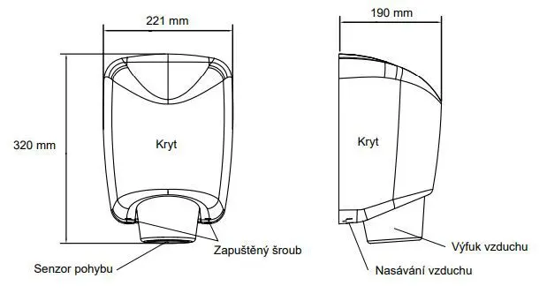 De droger start automatisch wanneer u uw handen erin steekt. De lucht wordt gefilterd door een stoffilter.