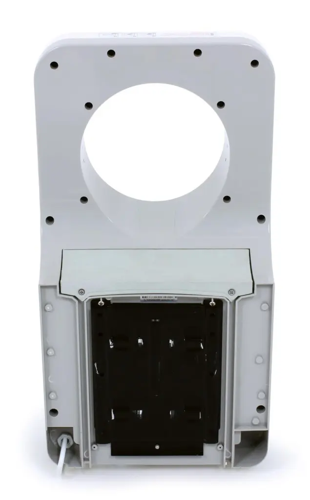 Het van de handen geblazen water komt terecht op de keramische plaat aan de achterzijde van de droger.