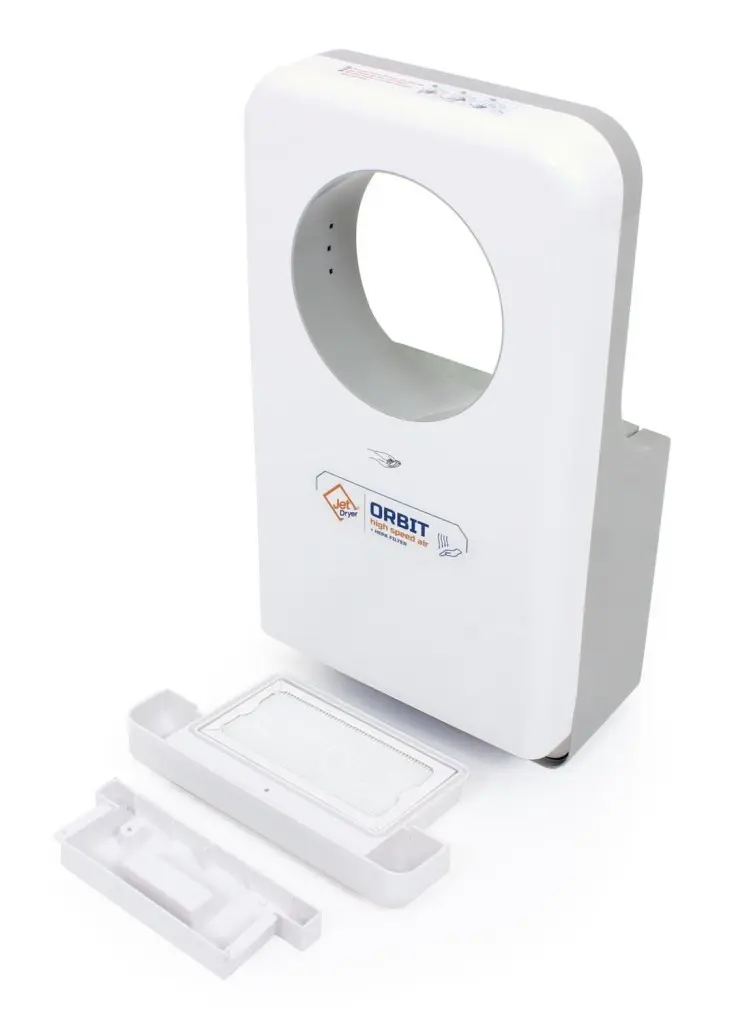 De Jet Dryer ORBIT is uitgerust met een gecombineerd vervangbaar filter. Eerst worden de grotere stofdeeltjes opgevangen. Dit deel van het filter is voorzien van een antibacteriële laag. Het tweede filterniveau is het HEPA-filter, dat meer dan 99,97% van de deeltjes met een grootte van 300 nanometer opvangt.