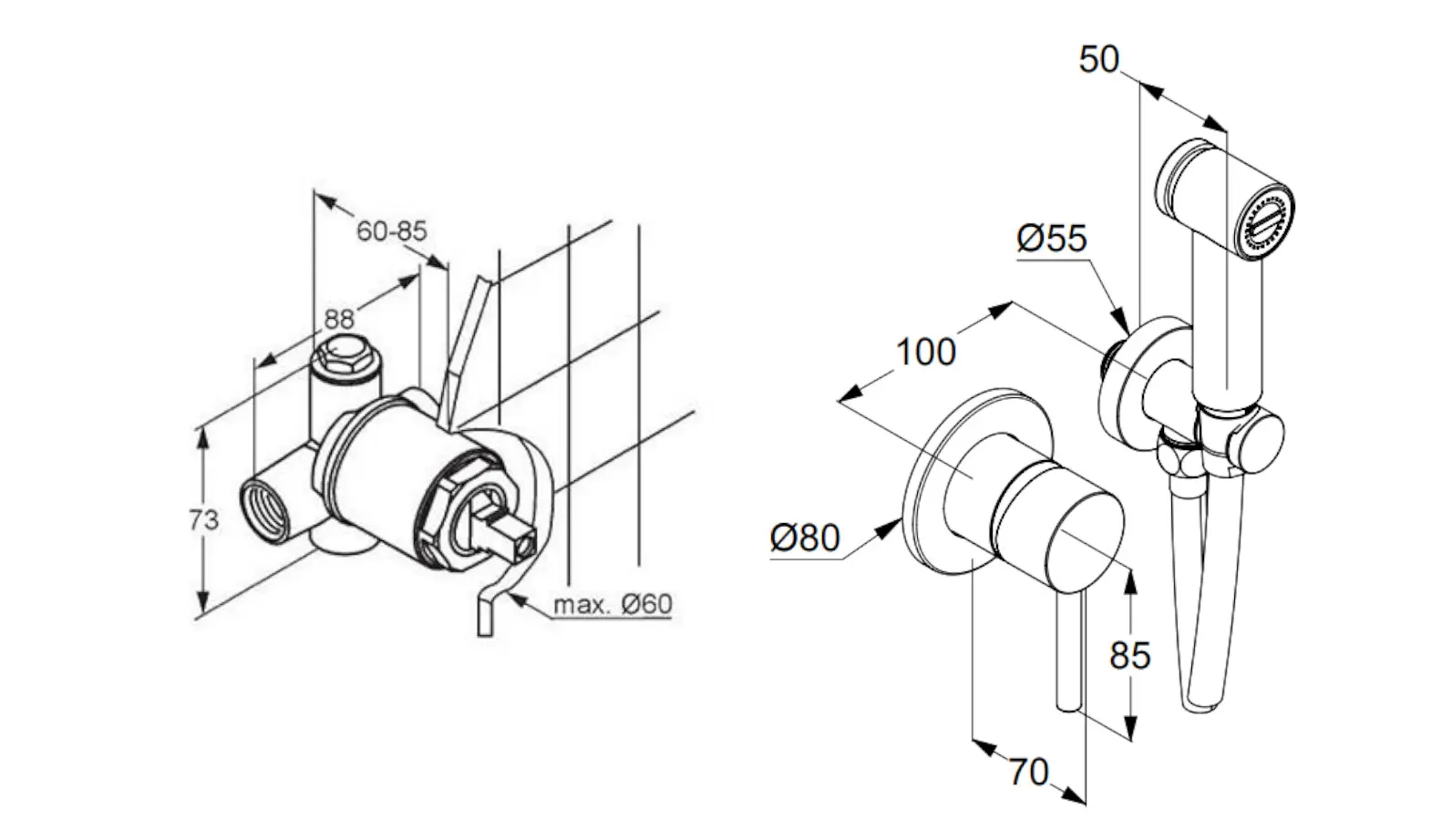 Eengreeps inbouwkraan met bidetdouche, inclusief inbouwdeel