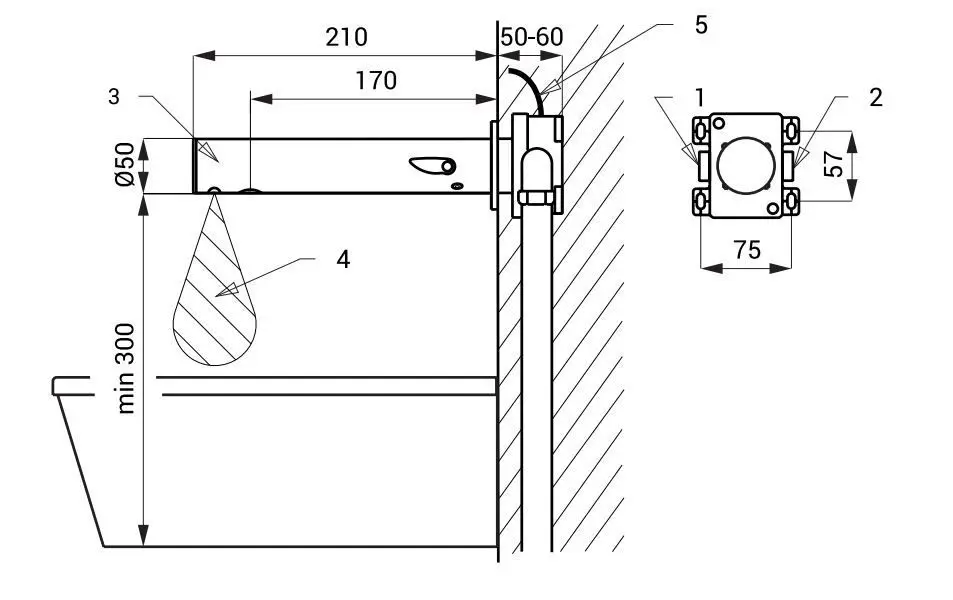- instelling uitschakeltijd: 0,25-7,75 s (water wordt afgesloten wanneer de handen uit de detectiezone worden gehaald)