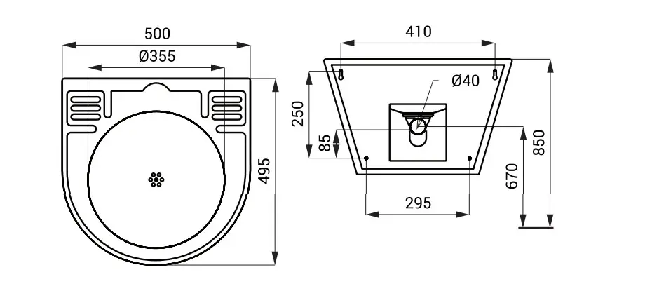 Roestvrijstalen conische wastafel zonder overloop, diameter 355 mm