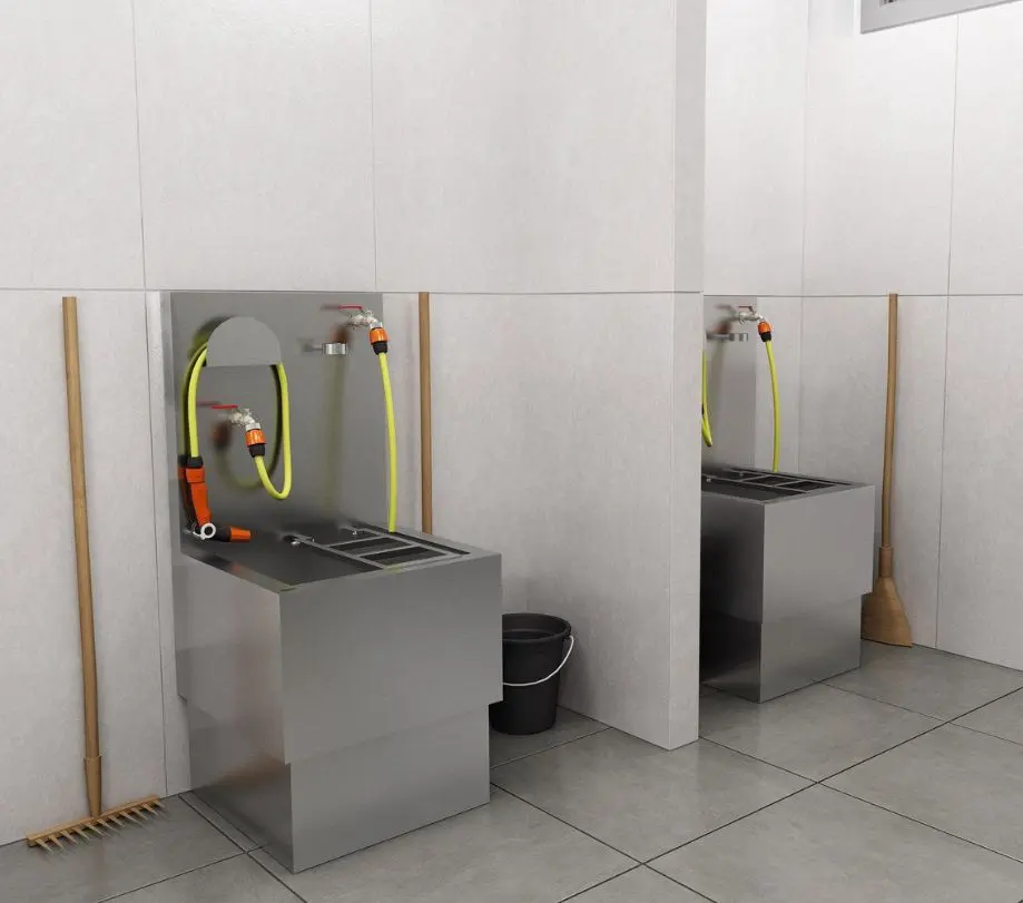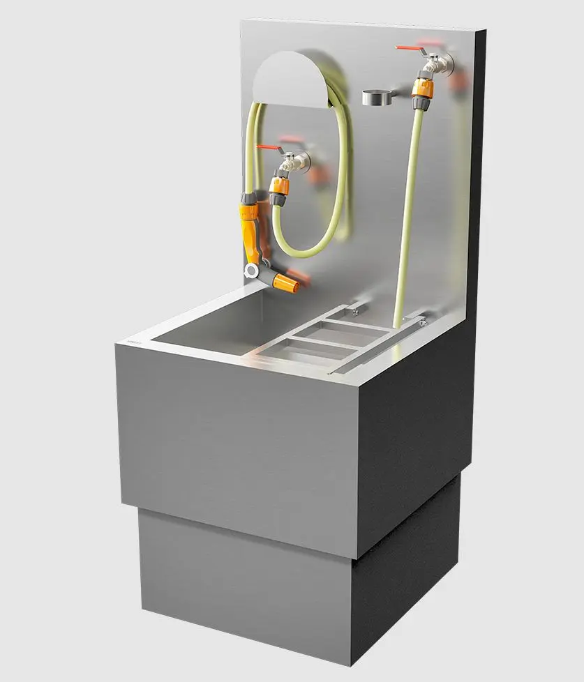 - met slang voor het doorspoelen van de toiletcassette, vulkraan en rooster