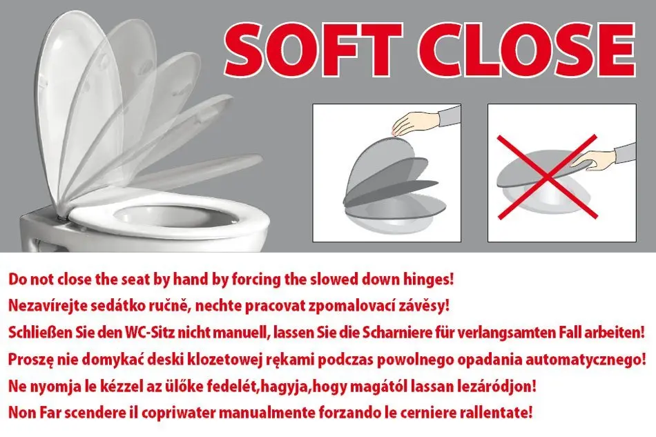 SoftClose systeem – langzame sluiting van zitting en deksel – zorgt voor veiligheid; dankzij het hydraulische systeem zakken het deksel en de zitting langzaam op de closetpot.