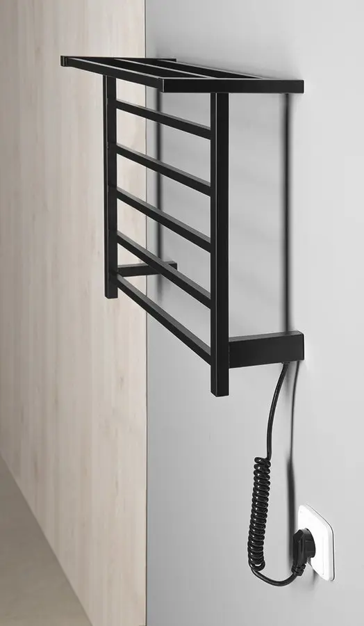 De droger is gemaakt van roestvrij staal en heeft een matzwarte kleur. Met afmetingen van 500 x 475 x 220 mm past hij in een kleine badkamer, waar u het praktische ontwerp van de vormgeving met een verwarmde bovenbak voor het opbergen van handdoeken zult waarderen. Het vermogen is 50 W en de schakelaar is rechtsonder in het apparaat geïntegreerd. De droger kan direct in het stopcontact gestoken worden dankzij een 1,2 meter lang snoer met stekker.