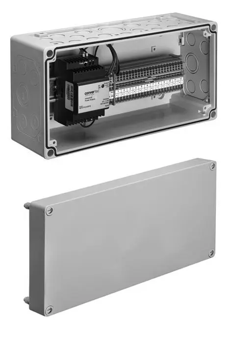 - E-verdeelkast met SCHELL voeding voor 1-12 kleppen, geïnstalleerd op montagerail inclusief 12-weg aansluitklemmenblok