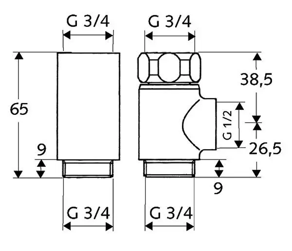 - T-stuk met oploopmoer G 3/4 IGxG 3/4 AGxG 1/2 IG