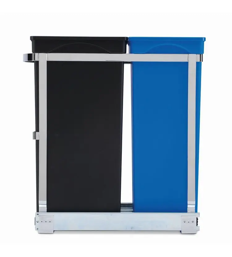 - in de massieve stalen constructie bevinden zich twee bakken: 20 l en 15 l, voor gewoon afval en voor afval dat voor hergebruik bestemd is