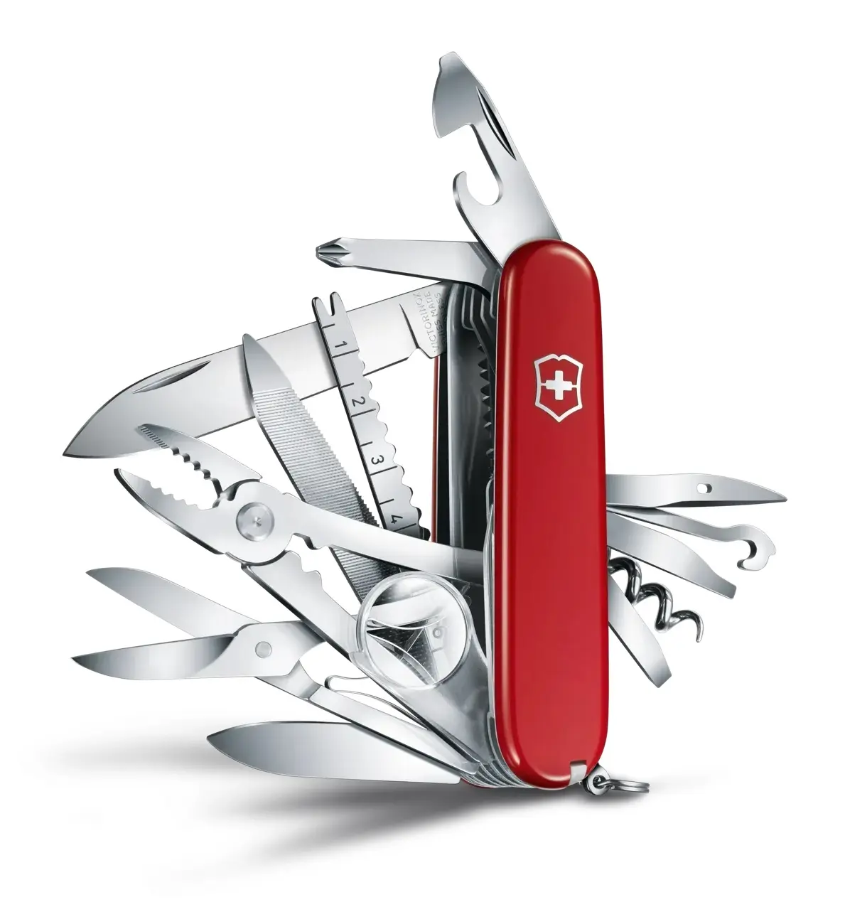 groot mes, klein mes, kurkentrekker, mini schroevendraaier 1,5/2.5/3/6 mm, blikopener, flesopener, striptang, ruimer, pons en priem, schaar, houtvijl, nagelvijl, nagelreiniger, metaalvijl, metaalzaag, kruiskopschroevendraaier, multifunctionele haak, combinatietang, draadschaar, draadkrimper, vergrootglas, visschubschraper, liniaal, 4 mm beitel, sleutelring, speld, pincet, tandenstoker, balpen